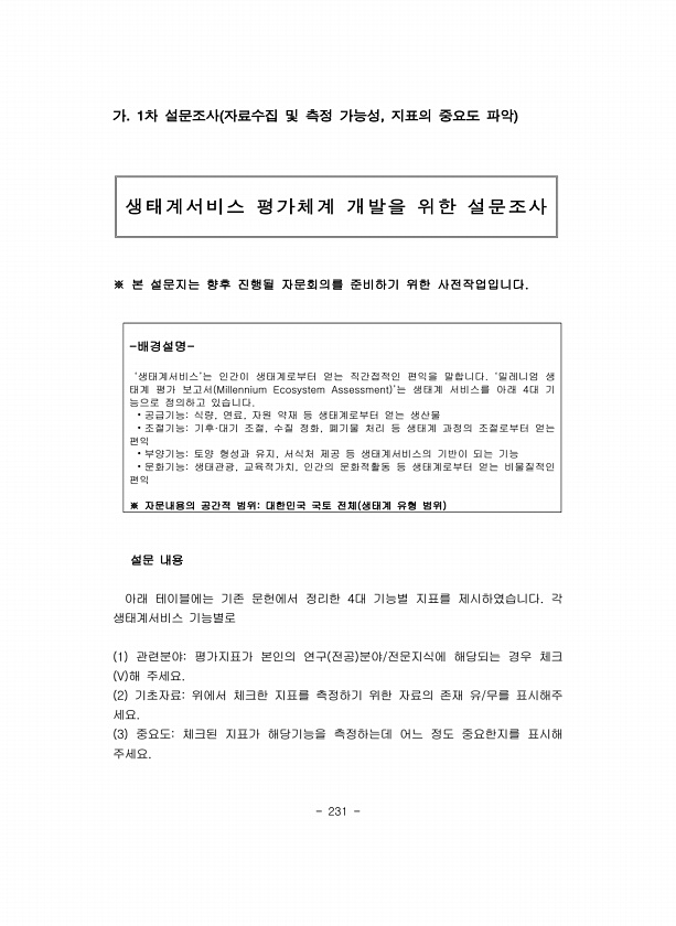 231 -배경설명- ‘생태계서비스’는 인간이 생태계로부터 얻는 직간접적인 편익을 말합니다. ‘밀레니엄 생 태계 평가 보고서 Millennium Ecosystem Assessment ’는 생태계 서비스를 아래 4대 기 능으로 정의하고 있습니다. ?공급기능식량, 연료, 자원 약재 등 생태계로부터 얻는 생산물 ?조절기능기후·대기 조절, 수질 정화, 폐기물 처리 등 생태계 과정의 조절로부터 얻는 편익 ?부양기능토양 형성과 유지, 서식처 제공 등 생태계서비스의 기반이 되는 기능 ?문화기능생태관광, 교육적가치, 인간의 문화적활동 등 생태계로부터 얻는 비물질적인 편익 ※ 자문내용의 공간적 범위대한민국 국토 전체 생태계 유형 범위 가 차 설문조사 자료수집 및 측정 가능성 지표의 중요도 파악 ※ 본 설문지는 향후 진행될 자...