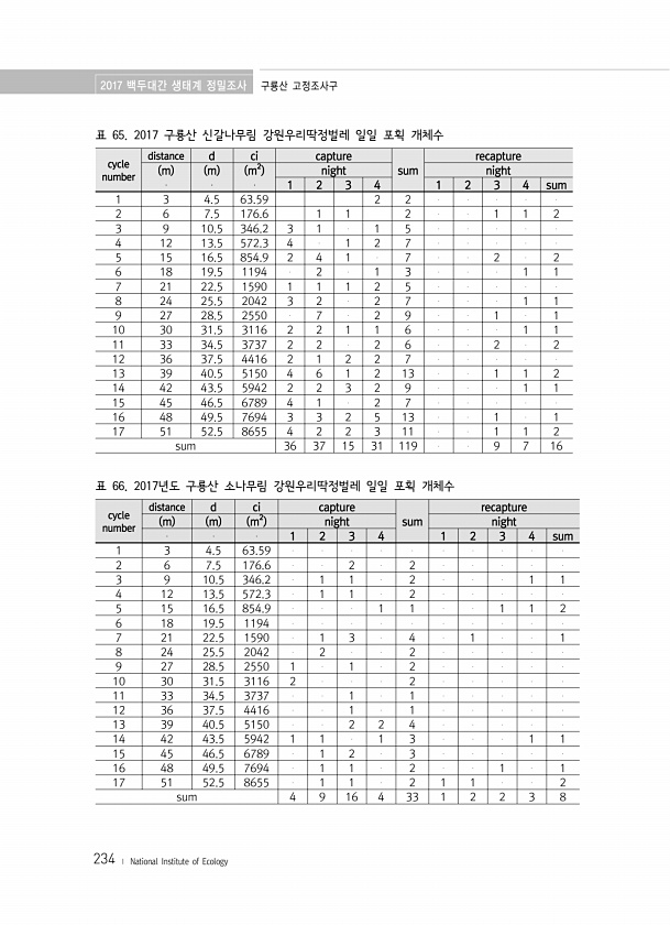 2017 백두대간 생태계 정밀조사 구룡산 고정조사구 234 ? National Institute of Ecology 표 65. 2017 구룡산 신갈나무림 강원우리딱정벌레 일일 포획 개체수 cycle number distance d ci capture sum recapture m m m2 night night 1 2 3 4 1 2 3 4 sum 1 3 4.5 63.59 2 2 2 6 7.5 176.6 1 1 2 1 1 2 3 9 10.5 346.2 3 1 1 5 4 12 13.5 572.3 4 1 2 7 5 15 16.5 854.9 2 4 1 7 2 2 6 18 19.5 1194 2 1 3 1 1 7 21 22.5 1590 1 ...