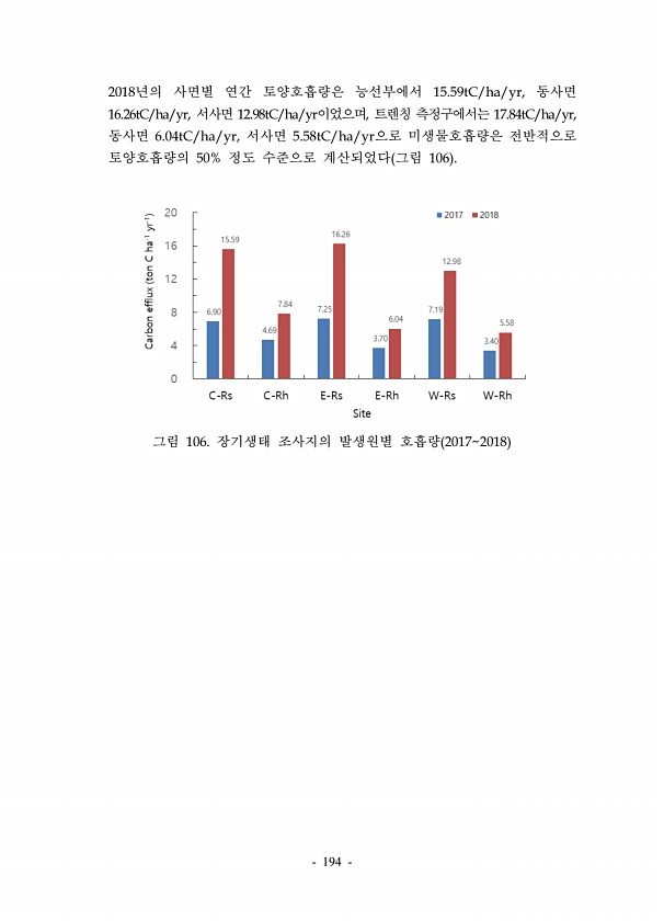 194 2018년의 사면별 연간 토양호흡량은 능선부에서 15.59tC/ha/yr, 동사면 16.26tC/ha/yr, 서사면 12.98tC/ha/yr이었으며, 트렌칭 측정구에서는 17.84tC/ha/yr, 동사면 6.04tC/ha/yr, 서사면 5.58tC/ha/yr으로 미생물호흡량은 전반적으로 토양호흡량의 50% 정도 수준으로 계산되었다 그림 106 그림 106. 장기생태 조사지의 발생원별 호흡량 20172018