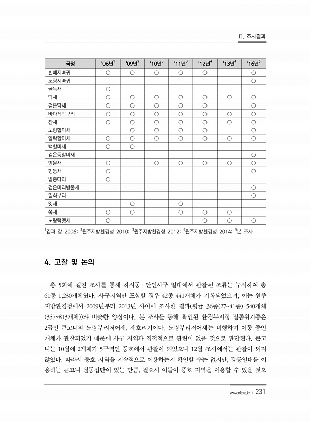 Ⅱ. 조사결과 www.nie.re.kr ? 231 국명 ‘06년1 ‘09년2 ‘10년3 ‘11년3 ‘12년4 ‘13년4 ‘16년5 흰배지빠귀 ○ ○ ○ ○ ○ ○ 노랑지빠귀 ○ 굴똑새 ○ 딱새 ○ ○ ○ ○ ○ ○ ○ 검은딱새 ○ ○ ○ ○ ○ ○ 바다직박구리 ○ ○ ○ ○ ○ ○ ○ 참새 ○ ○ ○ ○ ○ ○ ○ 노랑할미새 ○ ○ ○ ○ ○ 알락할미새 ○ ○ ○ ○ ○ ○ ○ 백할미새 ○ ○ 검은등할미새 ○ 방울새 ○ ○ ○ ○ ○ ○ 힝둥새 ○ ○ 밭종다리 ○ 검은머리방울새 ○ 밀화부리 ○ 멧새 ○ ○ 쑥새 ○ ○ ○ ○ ○ 노랑턱멧새 ○ ○ ○ ○ 1김과 강 2006; 2원주지방환경청 2010; 3원주지방환경청 2012; 4원주지방환경청 2014; 5본 조사 4. 고찰 및 논의 총 5회에 걸친 조사를 ...