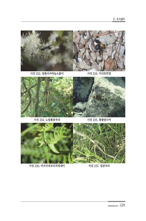 II. 조사결과 www.nie.re.kr ?229 사진 232. 알통다리하늘소붙이 사진 233. 어리호박벌 사진 234. 노랑뿔잠자리 사진 235. 왕팔랑나비 사진 236. 마쓰무라꼬리치레개미 사진 237.밀잠자리