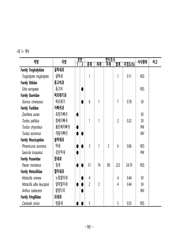 981 표 1 계속 학명 국명 문헌 현지조사 서식형태 비고 1 2 춘계 하계 추계 합계 우점도 % Family Troglodytidae 굴뚝새과 Troglodytes troglodytes 굴뚝새 1 1 0.11 RES Family Sittidae 동고비과 Sitta europaea 동고비 ● RES Family Sturnidae 찌르레기과 Sturnus cineraceus 찌르레기 ● 6 1 7 0.78 SV Family Turdidae 지빠귀과 Zoothera aurea 호랑지빠귀 ● SV Turdus pallidus 흰배지빠귀 1 1 2 0.22 SV Turdus chrysolaus 붉은배지빠귀 ● PM Turdus eunomus 개똥지빠귀 ● ● WV Family Muscicapidae 솔딱새과 Pho...