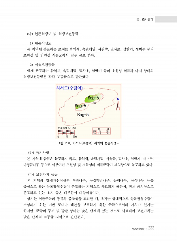 Ⅱ. 조사결과 www.nie.re.kr ? 233 다 현존식생도 및 식생보전등급 1 현존식생도 본 지역에 분포하는 초지는 참억새, 속털개밀, 사철쑥, 밀사초, 섬딸기, 새머루 등의 초원성 및 임연성 식물군락이 일부 분포 한다. 2 식생보전등급 현재 분포하는 참억새, 속털개밀, 밀사초, 섬딸기 등의 초원성 식물과 나지 상태의 식생보전등급은 각각 Ⅴ등급으로 판단했다. 그림 250. 하서도 수렁여 지역의 현존식생도 라 특기사항 본 지역에 삼림은 분포하지 않고, 참억새, 속털개밀, 사철쑥, 밀사초, 섬딸기, 새머루, 다정큼나무 등으로 이루어진 초원성 및 저목성의 식물군락이 패치상으로 분포하고 있다. 마 보전가치 등급 본 지역의 잠재자연식생은 후박나무, 구실잣밤나무, 동백나무, 참식나무 등을 중심으로 하는 상록활엽수...