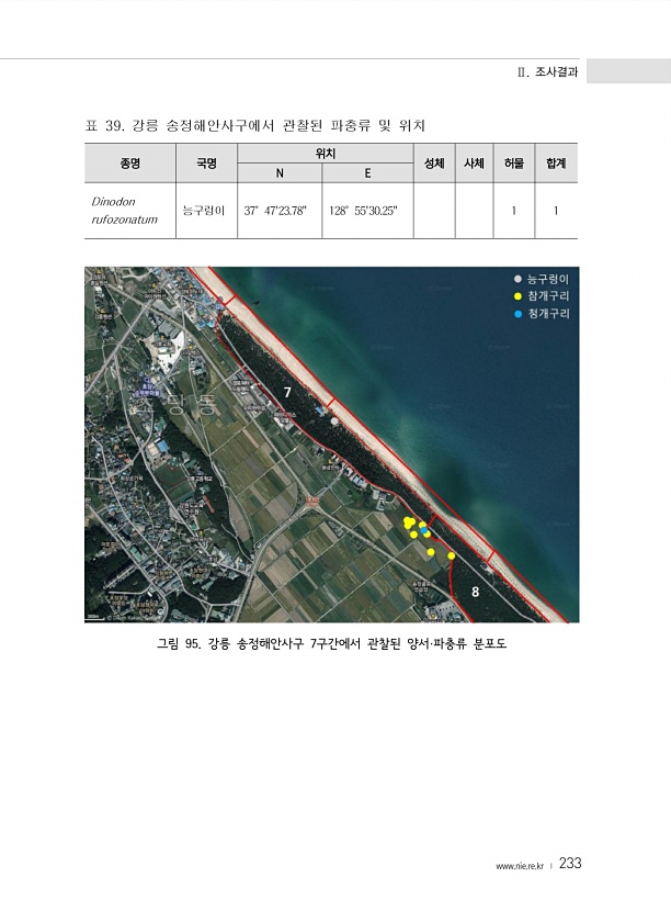 Ⅱ. 조사결과 www.nie.re.kr ? 233 종명 국명 위치 성체 사체 허물 합계 N E Dinodon rufozonatum 능구렁이 37°4723.78128°5530.251 1 표 39. 강릉 송정해안사구에서 관찰된 파충류 및 위치 그림 95. 강릉 송정해안사구 7구간에서 관찰된 양서·파충류분포도