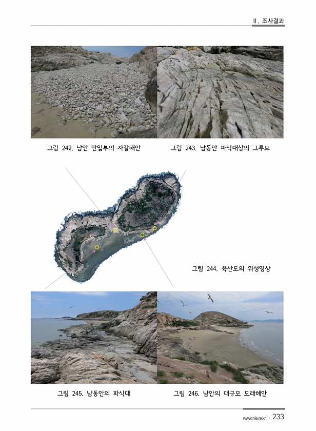 Ⅱ. 조사결과 www.nie.re.kr ? 233 그림 242. 남안 만입부의 자갈해안 그림 243. 남동안 파식대상의 그루브 그림 244. 육산도의 위성영상 그림 245. 남동안의 파식대 그림 246. 남안의 대규모모래해안