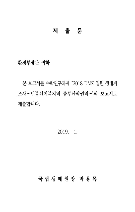 제 출 문 환경부장관 귀하 본 보고서를 수탁연구과제 “2018 DMZ 일원 생태계 조사 ? 민통선이북지역 중부산악권역 ?”의 보고서로 제출합니다. 2019. 1. 국 립 생 태 원 장 박 용목