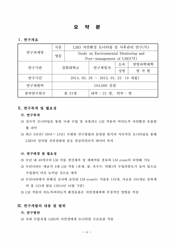 ii 요 약 문 Ⅰ. 연구개요 연구과제명 국문 LMO 자연환경 모니터링 및 사후관리 연구 Ⅵ 영문 Study on Environmental Monitoring and Post-management of LMO Ⅵ 연구기관 경희대학교 연구책임자 소속 생명과학대학 성명 엄 석 현 연구기간 2014. 05. 26 ~ 2015. 01. 23 8 개월 연구개발비 184,000 천원 참여연구원수 총 21명 내부 21 명, 외부 명 Ⅱ. 연구목적 및 필요성 가. 연구목적 ? 전국적 모니터링을 통한 국내 수입 및 유통되는 LM 작물의 비의도적 자연환경 유출현 황 파악 ? 최근 5년간 `09년`13년 수행된 연구방법과 동일한 방식의 지속적인 모니터링을 통해 LMO의 연차별 자연생태계 분포 양상의연속적 데이터 축적 나. 연구배...
