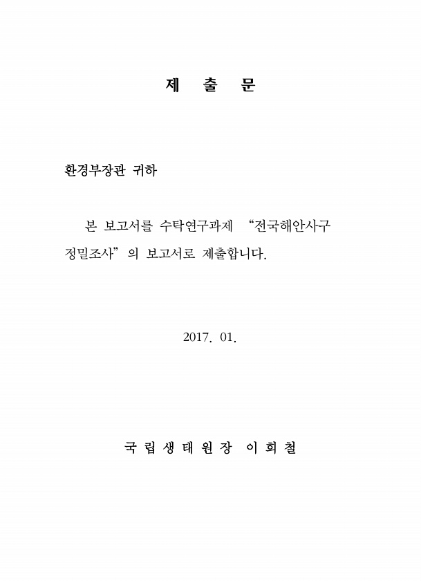 제 출 문 환경부장관 귀하 본 보고서를 수탁연구과제 “전국해안사구 정밀조사” 의 보고서로 제출합니다. 2017. 01. 국 립 생 태 원 장 이 희철