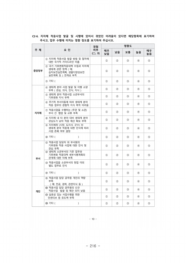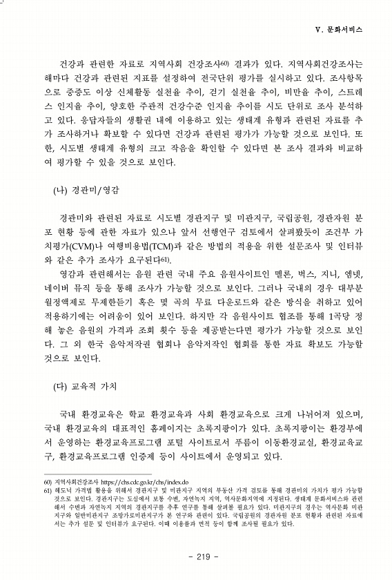 Ⅴ. 문화서비스 219 건강과 관련한 자료로 지역사회 건강조사60 결과가 있다. 지역사회건강조사는 해마다 건강과 관련된 지표를 설정하여 전국단위 평가를 실시하고 있다. 조사항목 으로 중증도 이상 신체활동 실천율 추이, 걷기 실천율 추이, 비만율 추이, 스트레 스 인지율 추이, 양호한 주관적 건강수준 인지율 추이를 시도 단위로 조사 분석하 고 있다. 응답자들의 생활권 내에 이용하고 있는 생태계 유형과 관련된 자료를 추 가 조사하거나 확보할 수 있다면 건강과 관련된 평가가 가능할 것으로 보인다. 또 한, 시도별 생태계 유형의 크고 작음을 확인할 수 있다면 본 조사 결과와 비교하 여 평가할 수 있을 것으로 보인다. 나 경관미/영감 경관미와 관련된 자료로 시도별 경관지구 및 미관지구, 국립공원, 경관자원 분 포 현...