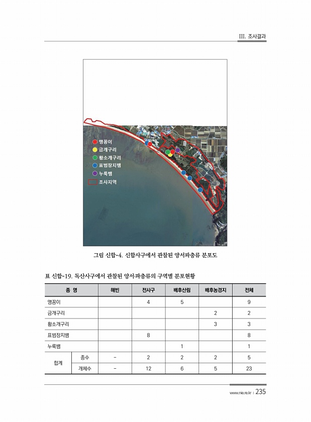 III. 조사결과 www.nie.re.kr ?235 그림 신합-4. 신합사구에서 관찰된 양서파충류 분포도 종 명 해빈 전사구 배후산림 배후농경지 전체 맹꽁이 4 5 9 금개구리 2 2 황소개구리 3 3 표범장지뱀 8 8 누룩뱀 1 1 합계 종수 2 2 2 5 개체수 12 6 5 23 표 신합-19. 독산사구에서 관찰된 양서?파충류의 구역별분포현황
