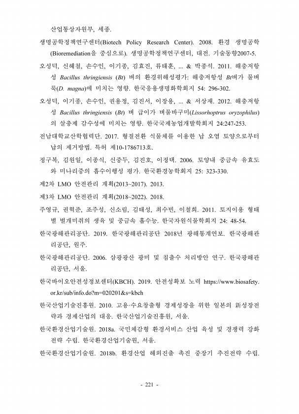 221 , Biotech Policy Research Center 2008. Bioremediation , 2007-5. , , , , , , ... & 2011. Bacillus thringiensis Bt Bt D. magna 54296-302. , , , , , , ... & 2012. Bacillus thringiensis Bt Lissorhoptrus oryzophilus 24247-253. 2017. 10-1786713 , , , , , 2006. 25323-330. 2 LMO 20132017 2013. 3 LMO 20182022 2018. , , , , , , 2011. 2448-54. 2019. 2018 , 2006. , KBCH 2019. https//www.biosafety. or.kr/s...