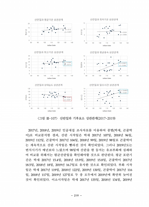 219 그림 Ⅲ-107 산란일과 기후요소 상관관계 2017-2019 2017년, 2018년, 2019년 인공새집 조사자료를 이용하여 종별 박새, 곤줄박 이 로 비교분석한 결과, 산란 시작일은 박새 2017년 107일, 2018년 96일, 2019년 112일, 곤줄박이 2017년 104일, 2018년 99일, 2019년 98일로 곤줄박이 는 계속적으로 산란 시작일은 빨라진 것이 확인되었다. 그러나 2019년도는 번식시기가 예년보다 느렸으며 98일에 산란을 한 둥지는 유조부화에 실패하 여 비교를 위해서는 평균산란일을 확인해야할 것으로 판단된다. 평균 포란기 간은 박새 2017년 15.4일, 2018년 15.9일, 2019년 15.8일, 곤줄박이 2017년 18.5일, 2018년 18일, 2019년 16.7일로 ...