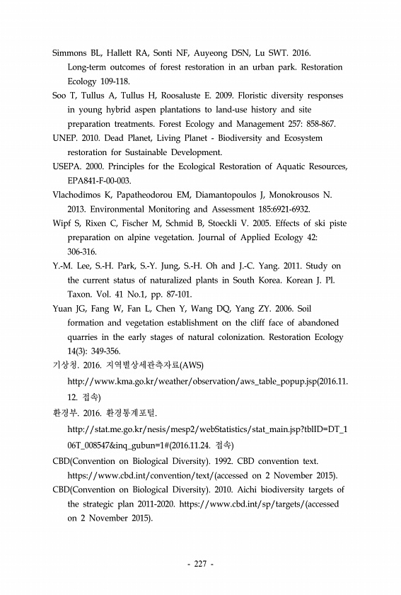 Simmons BL, Hallett RA, Sonti NF, Auyeong DSN, Lu SWT. 2016. Long-term outcomes of forest restoration in an urban park. Restoration Ecology 109-118. Soo T, Tullus A, Tullus H, Roosaluste E. 2009. Floristic diversity responses in young hybrid aspen plantations to land-use history and site preparation treatments. Forest Ecology and Management 257858-867. UNEP. 2010. Dead Planet, Living Planet Biodiv...