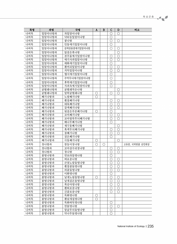 육 상 곤 충 National Institute of EcologyⅠ235 목명 과명 국명 A B C D 비고 나비목 잎말이나방과 차잎말이나방 ○ ○ 나비목 잎말이나방과 낙타등잎말이나방 ○ 나비목 잎말이나방과 콩나방 ○ ○ 나비목 잎말이나방과 인동애기잎말이나방 ○ 나비목 잎말이나방과 갈색잔물결애기잎말이나방 ○ ○ 나비목 잎말이나방과 앞검은혹나방 ○ 나비목 잎말이나방과 잔주름애기잎말이나방 ○ ○ 나비목 잎말이나방과 애기사과잎말이나방 ○ ○ 나비목 잎말이나방과 매화애기잎말이나방 ○ 나비목 잎말이나방과 흰머리잎말이나방 ○ ○ 나비목 잎말이나방과 치악잎말이나방 ○ ○ 나비목 잎말이나방과 맵시애기잎말이나방 ○ 나비목 잎말이나방과 주먹무늬애기잎말이나방 ○ 나비목 잎말이나방과 후박애기잎말이나방 ○ 나비목 잎말이나방과 사...