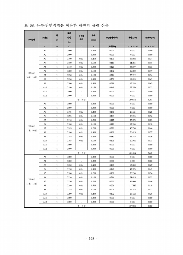198 조사날짜 소단면 폭 m 평균 수심 m 유속계 위치 유속 m/sec 소단면면적 m2 유량 L/sec 유량 m3/sec A B C D E 도면참조 H = E x G H = E x G 2016년 10월 14일 A1 1 0.000 0.000 0.000 0.000 0.000 A2 1 0.000 0.000 0.000 0.000 0.000 A3 1 0.190 0.6d 0.250 0.135 33.802 0.034 A4 1 0.100 0.6d 0.100 0.113 11.283 0.011 A5 1 0.110 0.6d 0.300 0.120 35.877 0.036 A6 1 0.200 0.6d 0.100 0.192 19.200 0.019 A7 1 0.230 0.6d 0.150 0.226 33.919 0.034 A8 1 0....