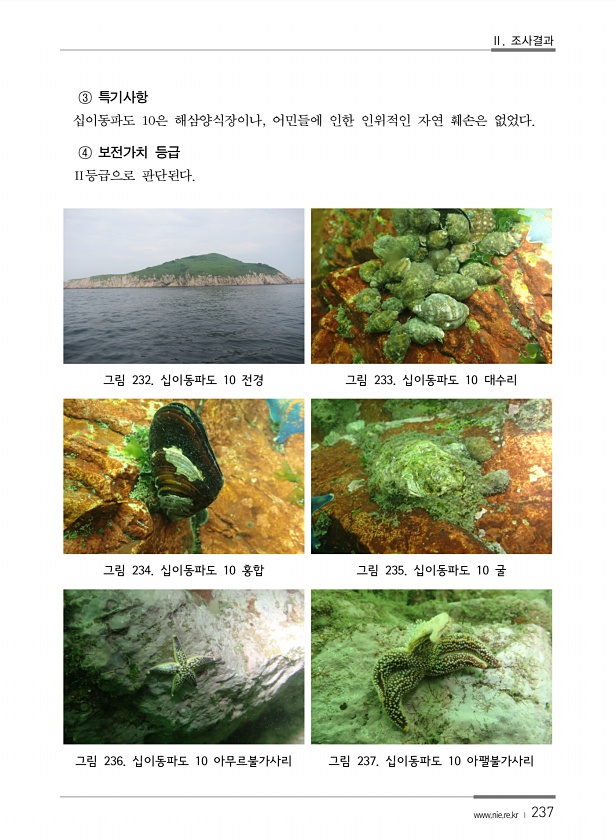 Ⅱ. 조사결과 www.nie.re.kr ? 237 ③ 특기사항 십이동파도 10은 해삼양식장이나, 어민들에 인한 인위적인 자연 훼손은 없었다. ④ 보전가치 등급 Ⅱ등급으로 판단된다. 그림 232. 십이동파도 10 전경 그림 233. 십이동파도 10 대수리 그림 234. 십이동파도 10 홍합 그림 235. 십이동파도 10 굴 그림 236. 십이동파도 10 아무르불가사리 그림 237. 십이동파도 10아팰불가사리