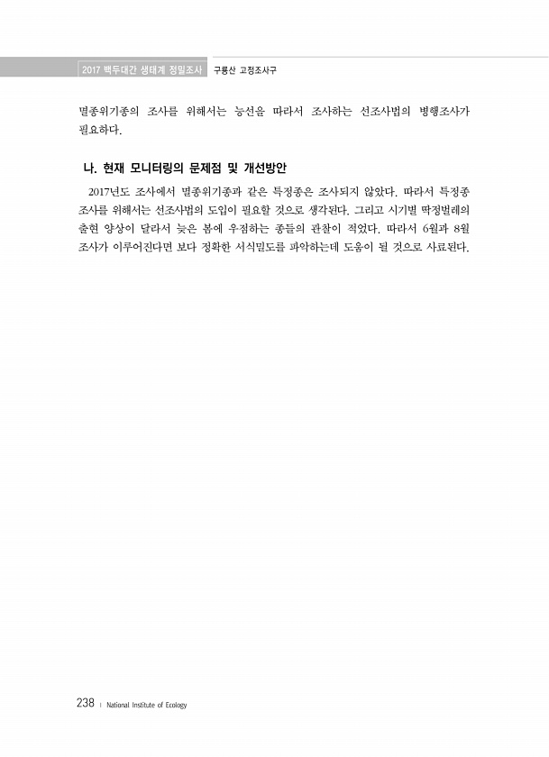 2017 백두대간 생태계 정밀조사 구룡산 고정조사구 238 ? National Institute of Ecology 멸종위기종의 조사를 위해서는 능선을 따라서 조사하는 선조사법의 병행조사가 필요하다. 나. 현재 모니터링의 문제점 및 개선방안 2017년도 조사에서 멸종위기종과 같은 특정종은 조사되지 않았다. 따라서 특정종 조사를 위해서는 선조사법의 도입이 필요할 것으로 생각된다. 그리고 시기별 딱정벌레의 출현 양상이 달라서 늦은 봄에 우점하는 종들의 관찰이 적었다. 따라서 6월과 8월 조사가 이루어진다면 보다 정확한 서식밀도를 파악하는데 도움이 될 것으로사료된다.