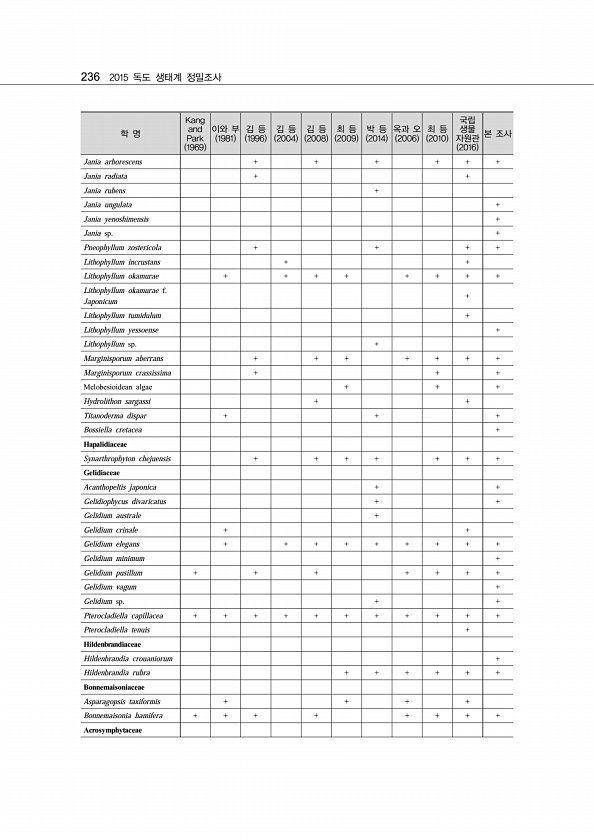 236 2015 독도 생태계 정밀조사 학 명 Kang and Park 1969 이와 부 1981 김 등 1996 김 등 2004 김 등 2008 최 등 2009 박 등 2014 옥과 오 2006 최 등 2010 국립 생물 자원관 2016 본 조사 Jania arborescens + + + + + + Jania radiata + + Jania rubens + Jania ungulata + Jania yenoshimensis + Jania sp. + Pneophyllum zostericola + + + + Lithophyllum incrustans + + Lithophyllum okamurae + + + + + + + + Lithophyllum okamurae f. Japonicum + Lithophyllum ...