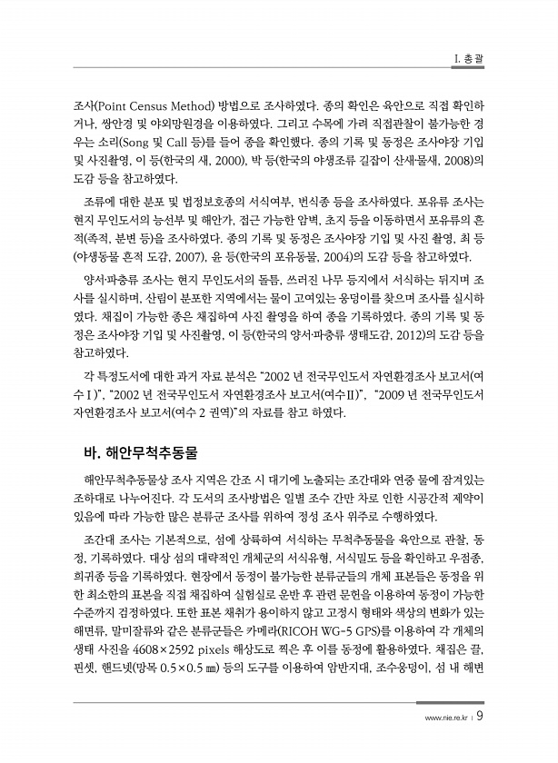 I. 총 괄 www.nie.re.kr ? 9 조사 Point Census Method 방법으로 조사하였다. 종의 확인은 육안으로 직접 확인하 거나, 쌍안경 및 야외망원경을 이용하였다. 그리고 수목에 가려 직접관찰이 불가능한 경 우는 소리 Song 및 Call 등 를 들어 종을 확인했다. 종의 기록 및 동정은 조사야장 기입 및 사진촬영, 이 등 한국의 새, 2000 , 박 등 한국의 야생조류 길잡이 산새?물새, 2008 의 도감 등을 참고하였다. 조류에 대한 분포 및 법정보호종의 서식여부, 번식종 등을 조사하였다. 포유류 조사는 현지 무인도서의 능선부 및 해안가, 접근 가능한 암벽, 초지 등을 이동하면서 포유류의 흔 적 족적, 분변 등 을 조사하였다. 종의 기록 및 동정은 조사야장 기입 및 사진 촬영, 최 등...