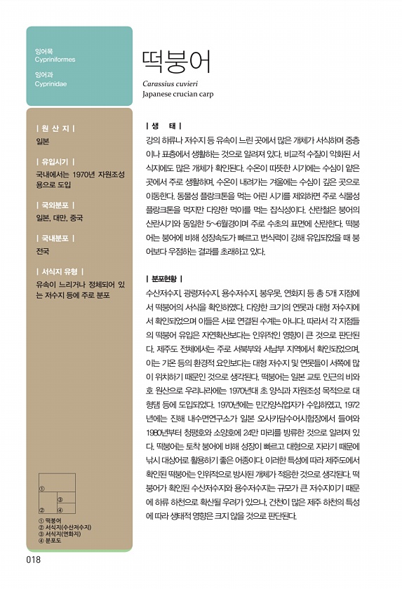 018 ① ② ③ ④ ① 떡붕어 ② 서식지 수산저수지 ③ 서식지 연화지 ④ 분포도 | 생 태 | 강의 하류나 저수지 등 유속이 느린 곳에서 많은 개체가 서식하며 중층 이나 표층에서 생활하는 것으로 알려져 있다. 비교적 수질이 악화된 서 식지에도 많은 개체가 확인된다. 수온이 따뜻한 시기에는 수심이 얕은 곳에서 주로 생활하며, 수온이 내려가는 겨울에는 수심이 깊은 곳으로 이동한다. 동물성 플랑크톤을 먹는 어린 시기를 제외하면 주로 식물성 플랑크톤을 먹지만 다양한 먹이를 먹는 잡식성이다. 산란철은 붕어의 산란시기와 동일한 56월경이며 주로 수초의 표면에 산란한다. 떡붕 어는 붕어에 비해 성장속도가 빠르고 번식력이 강해 유입되었을 때 붕 어보다 우점하는 결과를 초래하고 있다. | 분포현황 | 수산저수지, 광령저수...