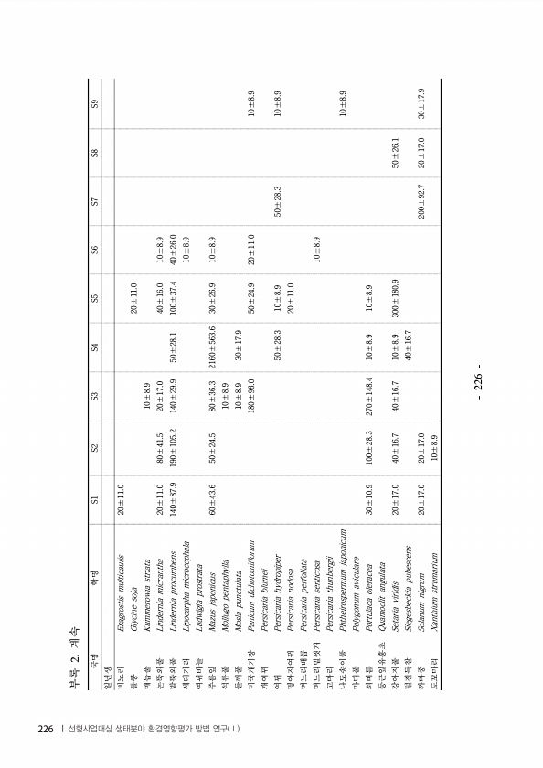 국명 학명 S1 S2 S3 S4 S5 S6 S7 S8 S9 일년생 비노리 Eragrostis multicaulis 20±11.0 돌콩 Glycine soja 20±11.0 매듭풀 Kummerowia striata 10±8.9 논뚝외풀 Lindernia micrantha 20±11.0 80±41.5 20±17.0 40±16.0 10±8.9 밭뚝외풀 Lindernia procumbens 140±87.9 190±105.2 140±29.9 50±28.1 100±37.4 40±26.0 세대가리 Lipocarpha microcephala 10±8.9 여뀌바늘 Ludwigia prostrata 주름잎 Mazus japonicus 60±43.6 50±24.5 80±36.3 2160±563.6 30±26.9 10±8.9 석...