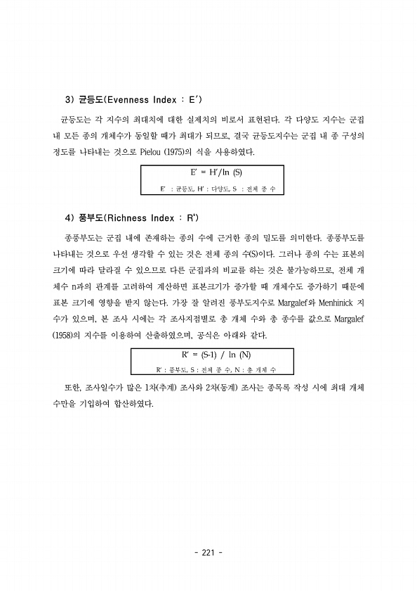 221 균등도는 각 지수의 최대치에 대한 실제치의 비로서 표현된다 각 다양도 지수는 군집 내 모든 종의 개체수가 동일할 때가 최대가 되므로 결국 균등도지수는 군집 내 종 구성의 , 정도를 나타내는 것으로 Pielou 1975 의 식을 사용하였다. 종풍부도는 군집 내에 존재하는 종의 수에 근거한 종의 밀도를 의미한다 종풍부도를 나타내는 것으로 우선 생각할 수 있는 것은 전체 종의 수 이다 그러나 종의 수는 표본의 S 크기에 따라 달라질 수 있으므로 다른 군집과의 비교를 하는 것은 불가능하므로 전체 개, 체수 과의 관계를 고려하여 계산하면 표본크기가 증가할 때 개체수도 증가하기 때문에 n 표본 크기에 영향을 받지 않는다 가장 잘 알려진 풍부도지수로 와 Margalef Menhinick 지 수가 있으며 본 조사 ...