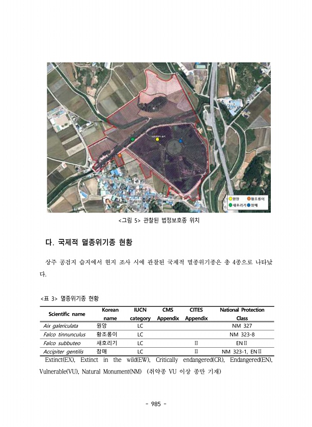 985 그림 5 관찰된 법정보호종 위치 다. 국제적 멸종위기종 현황 상주 공검지 습지에서 현지 조사 시에 관찰된 국제적 멸종위기종은 총 4종으로 나타났 다. Extinct EX , Extinct in the wild EW , Critically endangered CR , Endangered EN , Vulnerable VU , Natural Monument NM 취약종 VU 이상 종만 기재 Scientific name Korean name IUCN category CMS Appendix CITES Appendix National Protection Class Aix galericulata 원앙 LC NM 327 Falco tinnunculus 황조롱이 LC NM 323-8 Falco subbuteo 새호리...