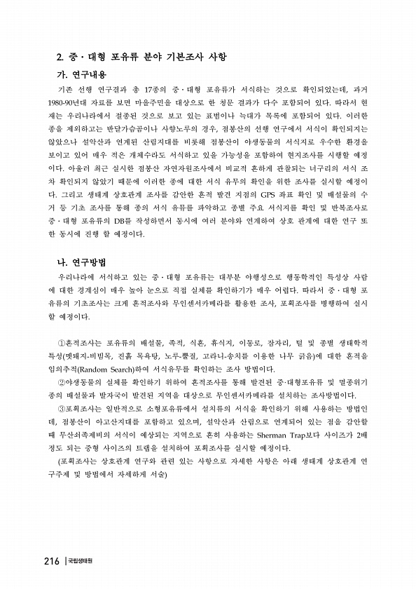 중 대형 포유류 분야 기본조사 사항 가 연구내용 기존 선행 연구결과 총 종의 중 대형 포유류가 서식하는 것으로 확인되었는데 과거 년대 자료를 보면 마을주민을 대상으로 한 청문 결과가 다수 포함되어 있다 따라서 현 재는 우리나라에서 절종된 것으로 보고 있는 표범이나 늑대가 목록에 포함되어 있다 이러한 종을 제외하고는 반달가슴곰이나 사향노루의 경우 점봉산의 선행 연구에서 서식이 확인되지는 않았으나 설악산과 연계된 산림지대를 비롯해 점봉산이 야생동물의 서식지로 우수한 환경을 보이고 있어 매우 적은 개체수라도 서식하고 있을 가능성을 포함하여 현지조사를 시행할 예정 이다 아울러 최근 실시한 점봉산 자연자원조사에서 비교적 흔하게 관찰되는 너구리의 서식 조 차 확인되지 않았기 때문에 이러한 종에 대한 서식 유무의 확인을...