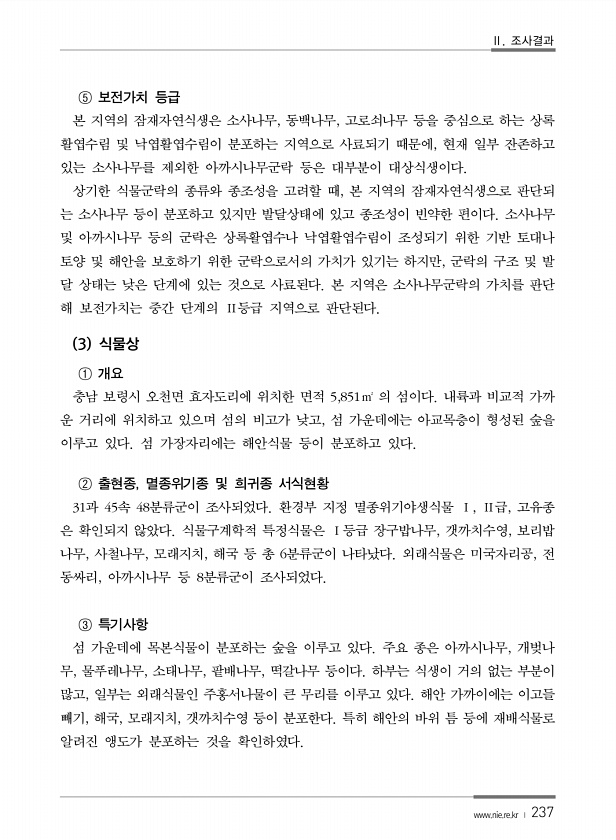 Ⅱ. 조사결과 www.nie.re.kr ? 237 ⑤ 보전가치 등급 본 지역의 잠재자연식생은 소사나무, 동백나무, 고로쇠나무 등을 중심으로 하는 상록 활엽수림 및 낙엽활엽수림이 분포하는 지역으로 사료되기 때문에, 현재 일부 잔존하고 있는 소사나무를 제외한 아까시나무군락 등은 대부분이 대상식생이다. 상기한 식물군락의 종류와 종조성을 고려할 때, 본 지역의 잠재자연식생으로 판단되 는 소사나무 등이 분포하고 있지만 발달상태에 있고 종조성이 빈약한 편이다. 소사나무 및 아까시나무 등의 군락은 상록활엽수나 낙엽활엽수림이 조성되기 위한 기반 토대나 토양 및 해안을 보호하기 위한 군락으로서의 가치가 있기는 하지만, 군락의 구조 및 발 달 상태는 낮은 단계에 있는 것으로 사료된다. 본 지역은 소사나무군락의 가치를 판단 해...