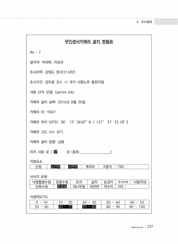 Ⅱ. 조사결과 www.nie.re.kr ? 237 무인센서카메라 설치 현황표 No 7 설치자박희복, 이상규 조사지역강원도 양구 21사단 조사구간감우골 코스 = 과거 사향노루 출현지점 사용 GPS 모델Garmin 64s 카메라 설치 날짜2016년 8월 30일 카메라 IDYG07 카메라 위치 GPS 38° 15’ 58.87N 127° 51’ 32.18E 카메라 고도 m 875 카메라 설치 방향남향 미끼 사용 유 무유 종류__________________ 지형요소 산정 능선부 사면부 계곡부 구릉지 기타 서식지 유형 낙엽활엽수림 침엽수림 초지 습지 농경지 주거지역 너덜지대 상록수림 혼합림 대나무림 하천변 저수지 기타 식생피도 % 0 10 10 20 20 30 30 40 40 50 50 60 60 70 70 80 8...