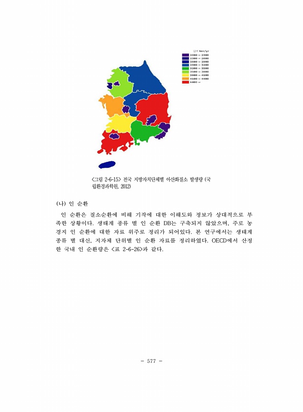 577 그림 2-6-15 전국 지방자치단체별 아산화질소 발생량 국 립환경과학원, 2012 나 인 순환 인 순환은 질소순환에 비해 기작에 대한 이해도와 정보가 상대적으로 부 족한 상황이다. 생태계 종류 별 인 순환 DB는 구축되지 않았으며, 주로 농 경지 인 순환에 대한 자료 위주로 정리가 되어있다. 본 연구에서는 생태계 종류 별 대신, 지자체 단위별 인 순환 자료를 정리하였다. OECD에서 산정 한 국내 인 순환량은 표 2-6-26 과같다.