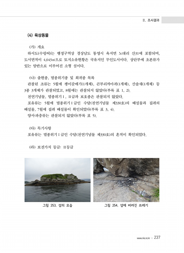 Ⅱ. 조사결과 www.nie.re.kr ? 237 4 육상동물 가 개요 하서도 수렁여 는 행정구역상 경상남도 통영시 욕지면 노대리 산31에 포함되며, 도서면적이 4,643㎡으로 토지소유현황은 국유지인 무인도서이다. 상단부에 초본류가 있는 암반으로 이루어진 소형 섬이다. 나 출현종, 멸종위기종 및 희귀종 목록 관찰된 조류는 5월에 괭이갈매기 1개체 , 큰부리까마귀 1개체 , 산솔새 1개체 등 3종 3개체가 관찰되었고, 8월에는 관찰되지 않았다 부록 표 1, 2 천연기념물, 멸종위기Ⅰ, Ⅱ급과 보호종은 관찰되지 않았다. 포유류는 5월에 멸종위기Ⅰ급인 수달 천연기념물 제330호 의 배설물과 집쥐의 배설물, 7월에 집쥐 배설물이 확인되었다 부록 표 3, 4 양서?파충류는 관찰되지 않았다 부록 표 5 다 특기사항 포...