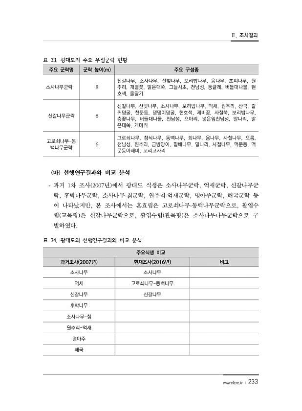 Ⅱ. 조사결과 www.nie.re.kr ? 233 표 33. 광대도의 주요 우점군락 현황 주요 군락명 군락 높이 m 주요 구성종 소사나무군락 8 신갈나무, 소사나무, 산벚나무, 보리밥나무, 음나무, 초피나무, 원 추리, 개별꽃, 맑은대쑥, 그늘사초, 천남성, 둥글레, 버들대나물, 현 호색, 줄딸기 신갈나무군락 8 신갈나무, 산벚나무, 소사나무, 보리밥나무, 억새, 원추리, 산국, 갈 퀴덩굴, 천문동, 댕댕이덩굴, 현호색, 제비꽃, 사철쑥, 보리밥나무, 층꽃나무, 버들대나물, 천남성, 으아리, 넓은잎천남성, 말나리, 맑 은대쑥, 개미취 고로쇠나무-동 백나무군락 6 고로쇠나무, 참식나무, 동백나무, 회나무, 음나무, 사철나무, 으름, 천남성, 원추리, 금방망이, 팥배나무, 말나리, 사철나무, 맥문동, 맥 문동아...