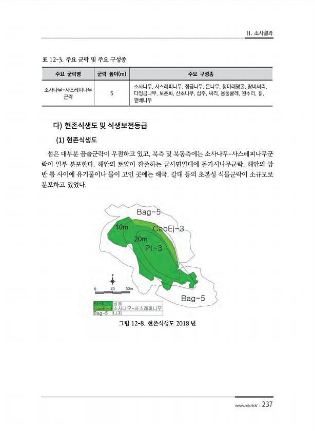 II. 조사결과 www.nie.re.kr ?237 주요 군락명 군락 높이 m 주요 구성종 소사나무-사스레피나무 군락 5 소사나무, 사스레피나무, 정금나무, 돈나무, 청미래덩굴, 땅비싸리, 다정큼나무, 보춘화, 산초나무, 삽주, 싸리, 용둥굴레, 원추리, 칡, 팥배나무 표 12-3. 주요 군락 및 주요 구성종 1 섬은 대부분 곰솔군락이 우점하고 있고, 북측 및 북동측에는 소사나무-사스레피나무군 락이 일부 분포한다. 해안의 토양이 잔존하는 급사면일대에 돌가시나무군락, 해안의 암 반 틈 사이에 유기물이나 물이 고인 곳에는 해국, 갈대 등의 초본성 식물군락이 소규모로 분포하고 있었다. 그림 12-8. 현존식생도 2018년