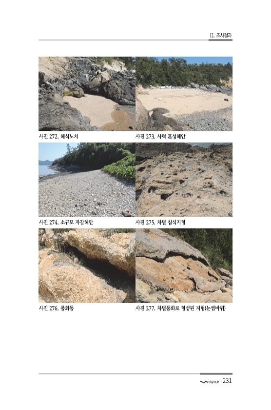 II. 조사결과 www.nie.re.kr ?231 사진 272. 해식노치 사진 273. 사력 혼성해안 사진 274. 소규모 자갈해안 사진 275. 차별 침식지형 사진 276. 풍화동 사진 277. 차별풍화로 형성된 지형 눈썹바위