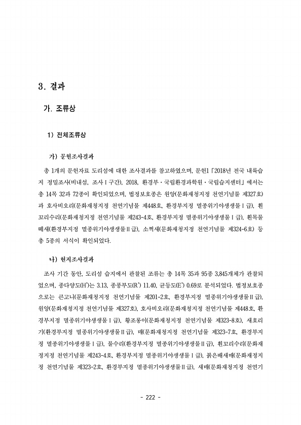 222 총 개의 문헌자료 도리섬에 대한 조사결과를 참고하였으며 문헌 년 전국 내륙습 1 , 1 2018「 지 정밀조사 비내섬 조사 구간 환경부 국립환경과학원 국립습지센터 에서는 , Ⅰ , 2018, · · 」 총 목 과 종이 확인되었으며 법정보호종은 원앙 문화재청지정 천연기념물 제 호 14 32 72 , 327 과 호사비오리 문화재청지정 천연기념물 제 호 환경부지정 멸종위기야생생물 급 흰 448 , Ⅰ , 꼬리수리 문화재청지정 천연기념물 제 호 환경부지정 멸종위기야생생물 급 흰목물 243-4 , Ⅰ , 떼새 환경부지정 멸종위기야생생물 급 소쩍새 문화재청지정 천연기념물 제 호 등 Ⅱ , 324-6 총 종의 서식이 확인되었다 5 조사 기간 동안 도리섬 습지에서 관찰된 조류는 총 목 과 종 개체가 관찰되 , 14...