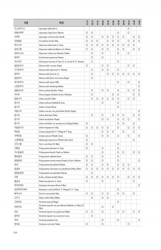 244 아스파라거스 Asparagus offcinalis L. ○ 방울비짜루 Asparagus oligoclonos Maxim. ○ ○ ○ ○ 비짜루 Asparagus schoberioides Kunth ○ ○ ○ ○ ○ ○ ○ ○ ○ 은방울꽃 Convallaria keiskei Miq. ○ ○ ○ ○ ○ ○ ○ ○ ○ 애기나리 Disporum smilacinum A. Gray ○ ○ ○ ○ ○ ○ ○ ○ ○ ○ 윤판나물 Disporum uniforum Baker ex S. Moore ○ ○ ○ ○ ○ ○ ○ ○ 큰애기나리 Disporum viridescens Maxim. Nakai ○ ○ ○ ○ 얼레지 Erythronium japonicum Decne. ○ ○ 처녀치마 Heloniopsis koreana ...