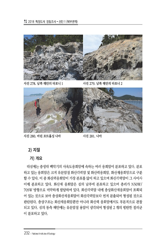 2018 특정도서 정밀조사 신안 1 북부권역 232 ? National Institute of Ecology 2 대섬에는 중생대 백악기의 사옥도응회암에 속하는 여러 응회암이 분포하고 있다. 분포 하고 있는 응회암은 크게 유문암질 화산각력암 및 화산력응회암, 화산재응회암으로 구분 할 수 있다. 이 중 화산력응회암이 가장 분포를 많이 하고 있으며 화산각력암이 그 사이사 이에 분포하고 있다. 화산재 응회암은 섬의 남부에 분포하고 있으며 층리가 N50W/ 70SW 방향으로 미약하게 발달하여 있다. 화산각력암 내에 층상화산재응회암이 포획되 어 있는 것으로 보아 층상화산재응회암이 화산각력암보다 먼저 분출되어 형성된 것으로 판단된다. 층상구조는 화산재응회암뿐만 아니라 화산력 응회암에서도 부분적으로 관찰 되고 있다. 섬의...
