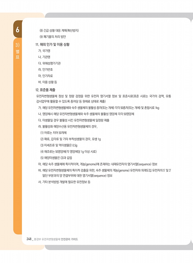 248 _ 환경부 유전자변형생물체 안전관리 가이드 6 별 표 3 8 긴급 상황 대응 계획 확산방지 9 폐기물의 처리 방안 11. 해외 인가 및 이용 상황 가. 국가명 나. 기관명 다. 위해성평가기관 라. 인가번호 마. 인가자료 바. 이용 상황 등 12. 표준품 제출 유전자변형생물체 정성 및 정량 검정을 위한 유전자 염기서열 정보 및 표준시료 표준 시료는 국가의 검역, 유통 감시업무에 활용할 수 있도록 종자당 등 원재료 상태로 제출 가. 해당 유전자변형생물체와 숙주 생물체의 불활성 종자 또는 개체 각각 50종자 또는 개체 및 혼합시료 1kg 나. 영양체시 해당 유전자변형생물체와 숙주 생물체의 불활성 영양체 각각 50영양체 다. 미생물일 경우 불활성 시킨 유전자변형생물체 일정량 제출 라. 불활성화 해양수산용 유...