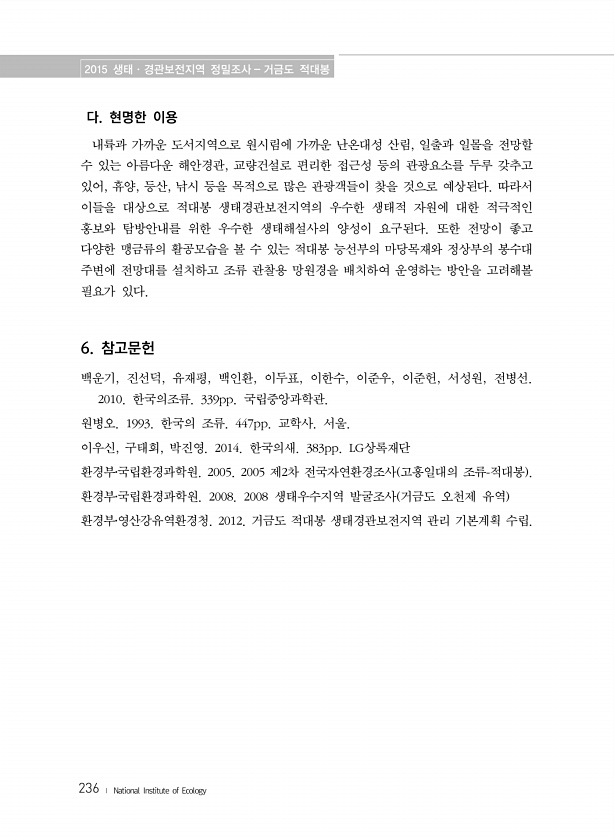 2015 생태·경관보전지역 정밀조사 거금도 적대봉 236 ? National Institute of Ecology 다. 현명한 이용 내륙과 가까운 도서지역으로 원시림에 가까운 난온대성 산림, 일출과 일몰을 전망할 수 있는 아름다운 해안경관, 교량건설로 편리한 접근성 등의 관광요소를 두루 갖추고 있어, 휴양, 등산, 낚시 등을 목적으로 많은 관광객들이 찾을 것으로 예상된다. 따라서 이들을 대상으로 적대봉 생태경관보전지역의 우수한 생태적 자원에 대한 적극적인 홍보와 탐방안내를 위한 우수한 생태해설사의 양성이 요구된다. 또한 전망이 좋고 다양한 맹금류의 활공모습을 볼 수 있는 적대봉 능선부의 마당목재와 정상부의 봉수대 주변에 전망대를 설치하고 조류 관찰용 망원경을 배치하여 운영하는 방안을 고려해볼 필요가 있다. ...