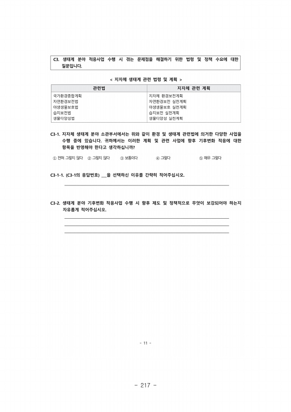 4장 주요 선진국의 생태분야 적응 정책 사례 227 다. 따라서 고해상도의 위성영상이나 항공영상을 활용하여 본 평가에서 밝히고 있는 높은 리스크 등급 지역에 대해 정밀측정을 수행하고, 주변 생태계를 보전하기 위한 전략 을 세울 필요가 있다. 다. 기후변화 영향에 대응한 생태 시스템의 안정화 방안 우리나라의 경우 「생물다양성 보전 및 이용에 관한 법 률」을 바탕으로 외래생물에 대한 관리가 이뤄지고 있다. 위 법 제7조5항에 의하면 「국가 생물다양성전략」 수립에 있어 ‘생물다양성에 영향을 주는 유입주의 생물 및 외래 생물의 관리’를 포함하도록 되어 있으며, 제17조4항에서 는 국가생물다양성센터에서 ‘외래생물종의 수출입 현황 관 리’를 할 수 있게 하였다. 동 법 제 5장「유입주의 생물 등 관리」에서는 유입주의 ...