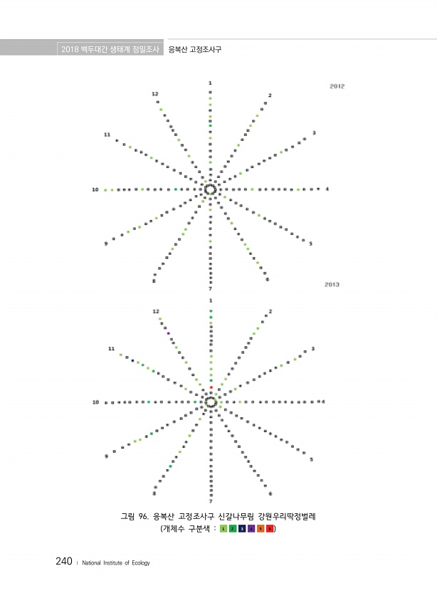 2018 백두대간 생태계 정밀조사 응복산 고정조사구 240 ? National Institute of Ecology 그림 96. 응복산 고정조사구 신갈나무림 강원우리딱정벌레 개체수 구분색