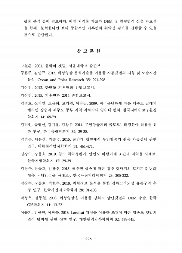 226 광물 분석 등이 필요하다. 이들 퇴적물 자료와 DEM 및 침수면적 산출 자료들 을 함께 분석한다면 보다 종합적인 기후변화 취약성 평가를 진행할 수 있을 것으로 판단된다. 참 고 문 헌 고철환. 2001. 한국의 갯벌. 서울대학교 출판부. 구본주, 김민규. 2013. 위성영상 분석기술을 이용한 시흥갯벌의 지형 및 노출시간 분석. Ocean and Polar Research 35291-298. 기상청. 2012. 한반도 기후변화 전망보고서. 기상청. 2015. 기후변화 2014 종합보고서. 김경호, 신지연, 고은희, 고기원, 이강근. 2009. 지구온난화에 따른 제주도 근해의 해수면 상승과 제주도 동부 지역 지하수의 염수대 변화. 한국지하수토양환경 학회지 1468-79. 김덕인, 송영선, 김기홍, 김창우...