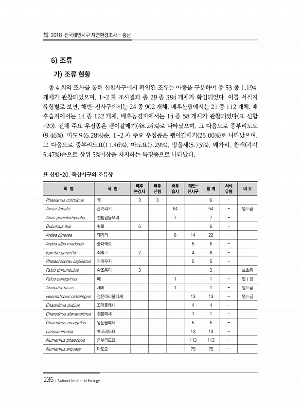 2018 전국해안사구 자연환경조사 충남 236 ? National Institute of Ecology 6 총 4 회의 조사를 통해 신합사구에서 확인된 조류는 아종을 구분하여 총 53 종 1,194 개체가 관찰되었으며, 12 차 조사결과 총 29 종 384 개체가 확인되었다. 이를 서식지 유형별로 보면, 해빈-전사구에서는 24 종 902 개체, 배후산림에서는 21 종 112 개체, 배 후습지에서는 14 종 122 개체, 배후농경지에서는 14 종 58 개체가 관찰되었다 표 신합 -20 전체 주요 우점종은 괭이갈매기 48.24% 로 나타났으며, 그 다음으로 중부리도요 9.46% , 마도요 6.28% 순, 12 차 주요 우점종은 괭이갈매기 25.00% 로 나타났으며, 그 다음으로 중부리도요 11.46% , 마도요...