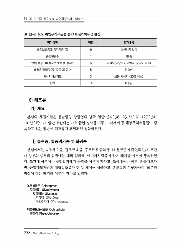 2018 전국 무인도서 자연환경조사 여수 2 238 ? National Institute of Ecology 평가항목 배점 평가내용 법정보호종 멸종위기종 등 0 출현하지 않음 총출현종수 1 18 종 군락형성정도 대상분포 보존성, 풍부도 5 미발달 대상분포 미발달, 풍부도 낮음 외래종 생태계교란종 포함 종수 5 미출현 서식지훼손정도 3 보통 서식지 20% 훼손 합계 14 II 등급 표 13-8. 토도 해안무척추동물 분야 보전가치등급 판정 6 본섬의 채집지점은 동남방향 장방형의 남쪽 암반 34˚38′ 23.21″ N, 127˚34′ 10.23″ E 이다. 암반 조간대는 다소 급한 경사를 이루며, 따개비 등 해양무척추동물이 생 육하고 있는 암반에 해조류가 띄엄띄엄 생육하였다. , 본섬에서는 녹조류 2 종, 갈조류...