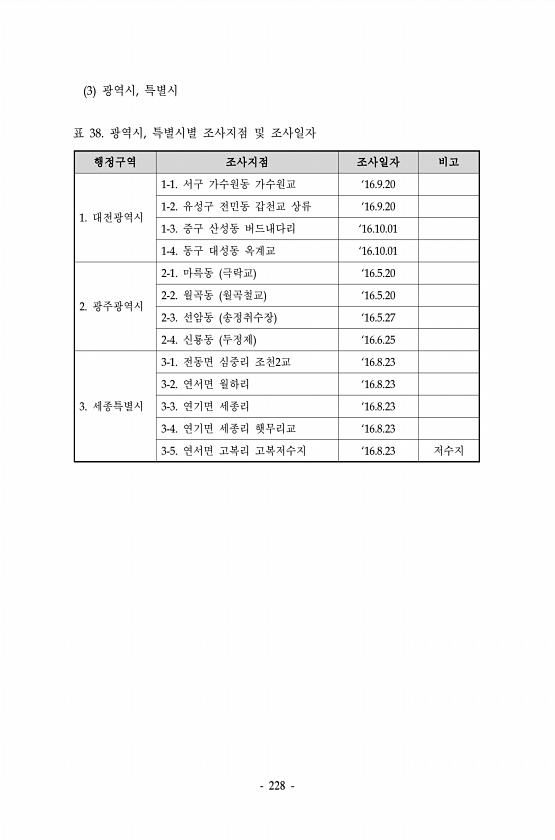 228 3 광역시, 특별시 표 38. 광역시, 특별시별 조사지점 및 조사일자 행정구역 조사지점 조사일자 비고 1. 대전광역시 1-1. 서구 가수원동 가수원교 ‘16.9.20 1-2. 유성구 전민동 갑천교 상류 ‘16.9.20 1-3. 중구 산성동 버드내다리 ‘16.10.01 1-4. 동구 대성동 옥계교 ‘16.10.01 2. 광주광역시 2-1. 마륵동 극락교 ‘16.5.20 2-2. 월곡동 월곡철교 ‘16.5.20 2-3. 선암동 송정취수장 ‘16.5.27 2-4. 신룡동 두정제 ‘16.6.25 3. 세종특별시 3-1. 전동면 심중리 조천2교 ‘16.8.23 3-2. 연서면 월하리 ‘16.8.23 3-3. 연기면 세종리 ‘16.8.23 3-4. 연기면 세종리 햇무리교 ‘16.8.23 3-5. 연서면 고복리 ...