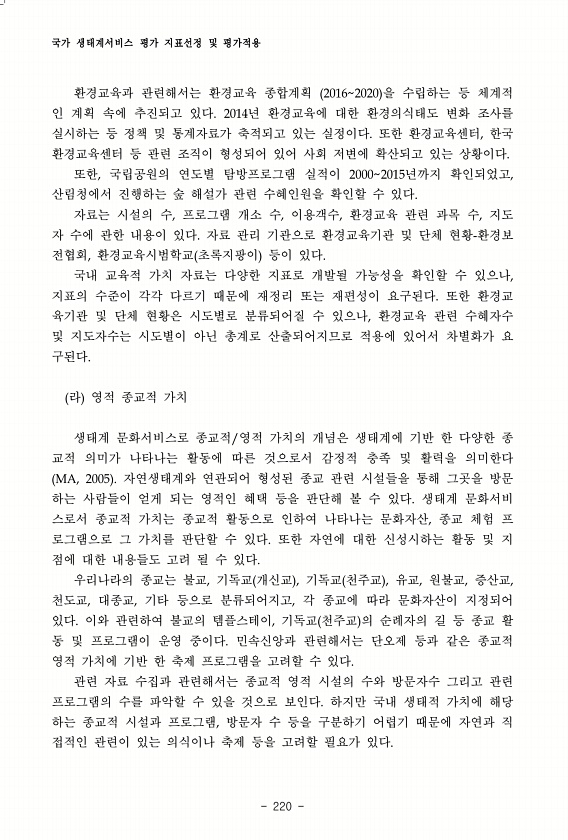 국가 생태계서비스 평가 지표선정 및 평가적용 220 환경교육과 관련해서는 환경교육 종합계획 20162020 을 수립하는 등 체계적 인 계획 속에 추진되고 있다. 2014년 환경교육에 대한 환경의식태도 변화 조사를 실시하는 등 정책 및 통계자료가 축적되고 있는 실정이다. 또한 환경교육센터, 한국 환경교육센터 등 관련 조직이 형성되어 있어 사회 저변에 확산되고 있는 상황이다. 또한, 국립공원의 연도별 탐방프로그램 실적이 20002015년까지 확인되었고, 산림청에서 진행하는 숲 해설가 관련 수혜인원을 확인할 수 있다. 자료는 시설의 수, 프로그램 개소 수, 이용객수, 환경교육 관련 과목 수, 지도 자 수에 관한 내용이 있다. 자료 관리 기관으로 환경교육기관 및 단체 현황-환경보 전협회, 환경교육시범학교 초록지팡이...