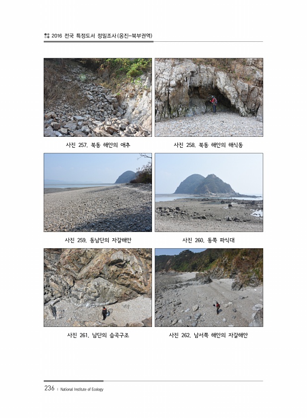 2016 전국 특정도서 정밀조사 옹진-북부권역 236 ? National Institute of Ecology 사진 257. 북동 해안의 애추 사진 258. 북동 해안의 해식동 사진 259. 동남단의 자갈해안 사진 260. 동쪽 파식대 사진 261. 남단의 습곡구조 사진 262. 남서쪽 해안의자갈해안