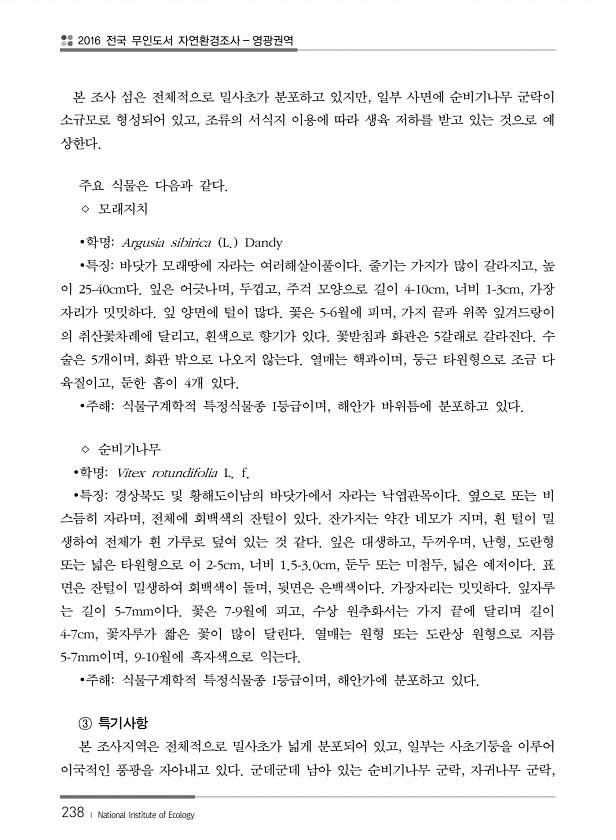 2016 전국 무인도서 자연환경조사 영광권역 238 ? National Institute of Ecology 본 조사 섬은 전체적으로 밀사초가 분포하고 있지만, 일부 사면에 순비기나무 군락이 소규모로 형성되어 있고, 조류의 서식지 이용에 따라 생육 저하를 받고 있는 것으로 예 상한다. 주요 식물은 다음과 같다. ◇ 모래지치 ?학명Argusia sibirica L. Dandy ?특징바닷가 모래땅에 자라는 여러해살이풀이다. 줄기는 가지가 많이 갈라지고, 높 이 25-40cm다. 잎은 어긋나며, 두껍고, 주걱 모양으로 길이 4-10cm, 너비 1-3cm, 가장 자리가 밋밋하다. 잎 양면에 털이 많다. 꽃은 5-6월에 피며, 가지 끝과 위쪽 잎겨드랑이 의 취산꽃차례에 달리고, 흰색으로 향기가 있다. 꽃받침과 화관은...
