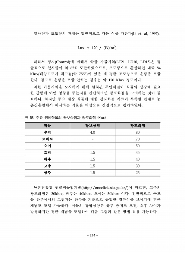 일사량과 조도량의 관계는 일반적으로 다음 식을 따른다 Li et. al, 1997 Lux ≒ 120 W/m2 따라서 평지 Control 에 비해서 약한 가뭄지역 LT21, LD10, LD15 은 평 균적으로 일사량이 약 65% 도달하였으므로, 조도량으로 환산하면 대략 84 Klux 태양고도가 최고점 약 75도 에 있을 때 평균 조도량으로 운량을 포함 한다. 참고로 운량을 포함 안하는 경우는 약 120 Klux 정도이다 약한 가뭄지역을 모사하기 위해 설치된 투명패널이 식물의 생장에 필요 한 광량에 어떤 영향을 주는지를 판단하려면 광포화점을 고려하는 것이 필 요하다. 하지만 주요 대상 식물에 대한 광포화점 자료가 부족한 관계로 농 촌진흥청에서 제시하는 작물을 대상으로 간접적으로 평가하였다. 작물 광보상점 광포화...